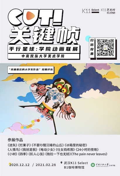 我院动画专业学生作品《迷失》、《烂果子》等14部动画短片作品入选 “CUT!关键帧:首届武汉国际动画艺术节‘平行单元’高校动画联展”。该展已于12月12日起在武汉K11 select B1咖啡博物馆展出,展期至2021年2月28日。展出期间,“最受观众欢迎的学生作品”评选开启,冠军可直通几个重要艺术奖项。