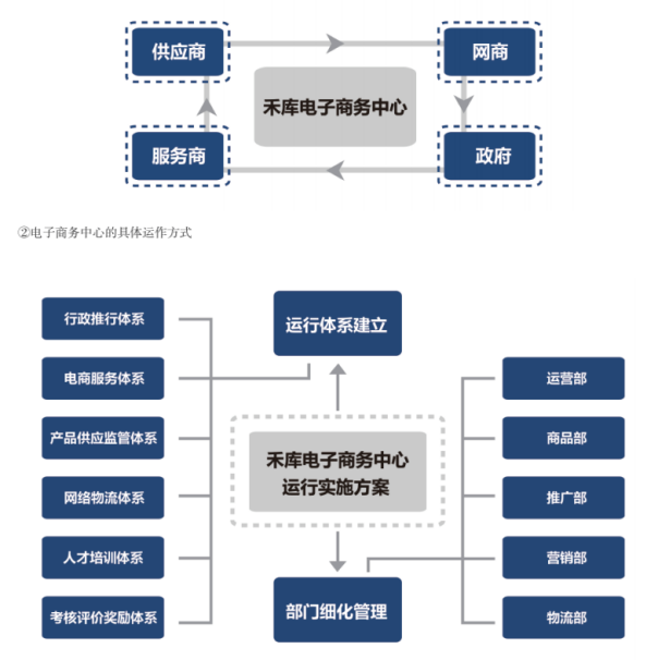 建立禾库电子商务中心,真正意义上的成为本地乡镇电子商务综合服务商,实现禾库地方产品的采购、仓储、分销的集中化操作和管理。它以电子商务为基础,打通多个平台,连接线上线下,协同供应商、网商、支撑型服务商(物流、银行、电信运营商)和政府等多方资源,为禾库本地的电子商务发展提供服务与支撑。