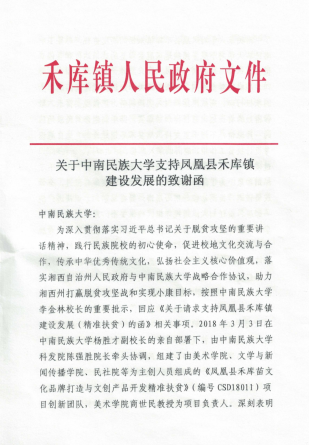 为深入贯彻落实习近平总书记关于脱贫攻坚的重要讲话精神,践行民族院校的初心使命,促进校地文化交流与合作,传承中华优秀传统文化,弘扬社会主义核心价值观,落实必赢官网与湘西自治州人民政府战略合作协议,助力湘西州打赢脱贫攻坚战和实现小康目标,按照李金林校长的重要批示,回应《关于请求支持凤凰县禾库镇建设发展(精准扶贫)的函》相关事项,2018年3月初,杨胜才副校长亲自安排部署,科发院陈强胜院长牵头协调,组建了由美术学院、文学与新闻传播学院、民族学与社会学学院、公共管理学院、经济学院等为主创人员组成的创新团队,并确定了《凤凰县禾库苗文化品牌打造与文创产品开发精准扶贫》(编号CSD18011)项目立项,美术学院商世民教授为项目负责人。