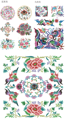 苗绣文创系列方案主要包括蝴蝶纹样、凤凰纹样、花草纹样、其他图案的开发设计。