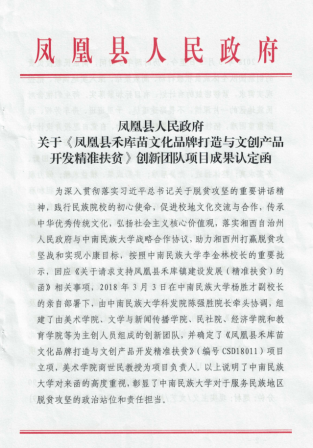 (2020年5月16日凤凰县人民政府关于《凤凰县禾库苗文化品牌打造与文创产品开发精准扶贫》创新团队项目成果认定函)