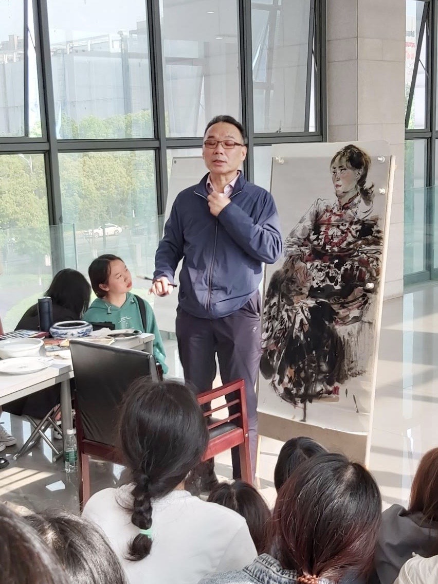 4月23日下午14:30,美术学院诚邀任惠中老师于光谷美术馆三楼开展水墨人物写生示范与师生交流活动。此次活动由美术学院副院长彭阳陵教授主持,绘画教研室主任陈雪亮老师,徐敏教授、陈岱老师莅临现场,绘画专业本科生和研究生全体参加。