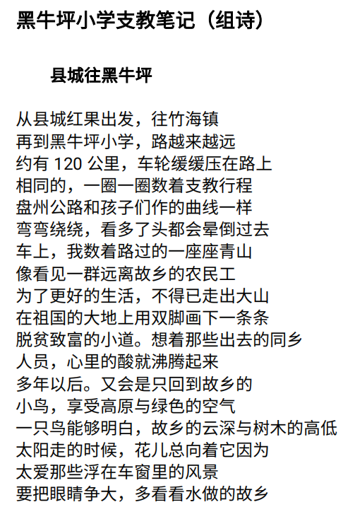 我院2018级本科生曾万同学的组诗《黑牛坪小学支教笔记》荣获创作类作品一等奖。《黑牛坪小学支教笔记》(组诗)记录了曾万同学2020年疫情期间,在家乡贵州省盘州市的一个偏远乡村小学20天支教生活的所见、所闻、所感,表达了他对家乡和学生的热爱之请。