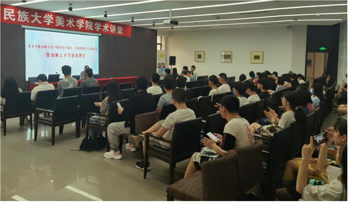 成彪老师依次简单向同学们介绍了三家来校宣讲和招聘的企业,强调了动画专业同学大三暑期实习实践的重要性。随后,三家企业分别从各自企业的成长背景入手,进行了15分钟左右的宣讲和介绍。宣讲中各个企业关于未来企业设想、用人计划和培养模式以及学生实习实践作品等的展示都引起了在场同学的强烈反响。