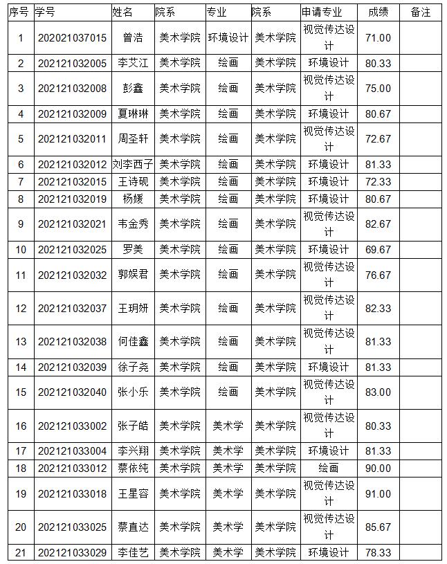按照《必赢国际437官网普通全日制本科学生转专业管理办法(修订)》(民大教学〔2017〕39号)、《关于做好2021级、2020级本科学生转专业与大类专业分流工作的通知》和《必赢国际437官网美术学院2021级本科生转专业实施细则》的要求,现将美术学院转专业拟录取名单公示如下: