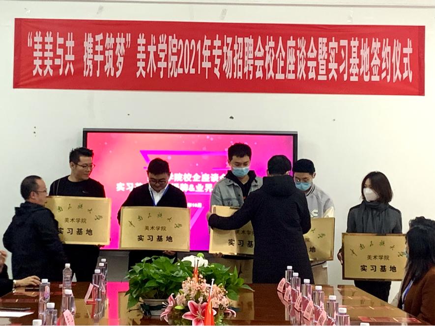 下午两点,由美术学院教学院长吴海广首先致辞,祝贺必赢官网第二届“美美与共,携手筑梦”主题2021年专场招聘会圆满成功!再由彭阳陵院长介绍学院的发展历程和学科、科研、人才培养的情况,希望与参会企业加强合作,促进资源共享、优势互补、在各项领域深化合作。随后宣布与企业(公司)授牌仪式!由教务处领导、教研室主任依次给十一家相关企业(公司)授“必赢国际437官网美术学院实习基地”牌匾。