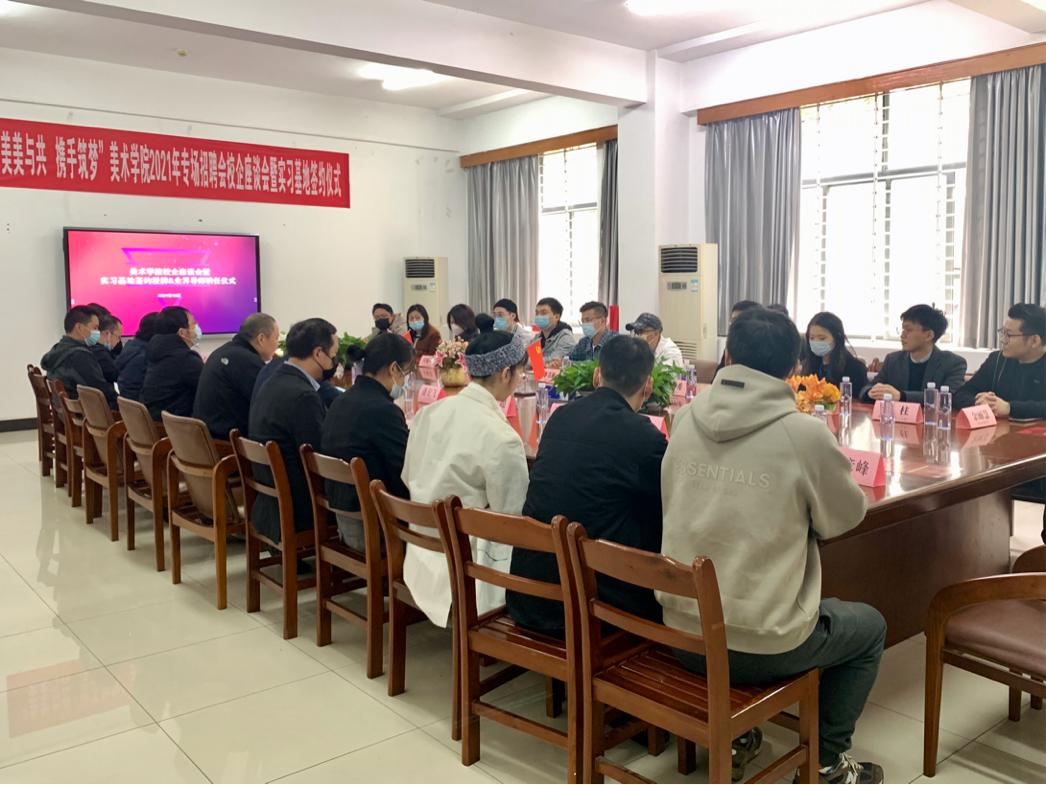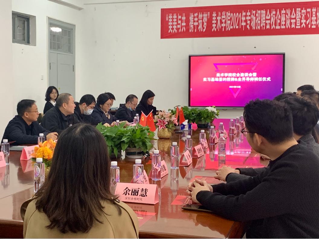 2021年10月22日下午,由必赢国际437官网美术学院主办,学校招生就业工作处承办的第二届“美美与共,携手筑梦”主题2021年专场招聘会在美院圆楼圆满举办。招聘会后举行了美术学院2021年专场招聘会校企座谈会暨实习基地签约仪式,仪式由美术学院教学院长彭阳陵主持,参会人员有:招聘企业公司代表,招就处领导潘宏飞,教务处领导李立,院长吴海广,副院长程超和教研室各主任们一同出席。