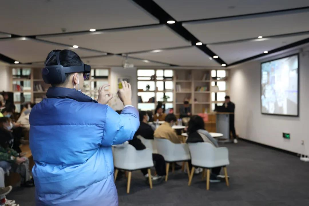 象新力科技Unity技术组负责人吴洋分享MR(混合现实)应用,结合微软Hololens头盔演示热能朗肯循环,在虚实结合的画面间,帮助同学们领会VR/AR技术发展与动画专业应用方向。