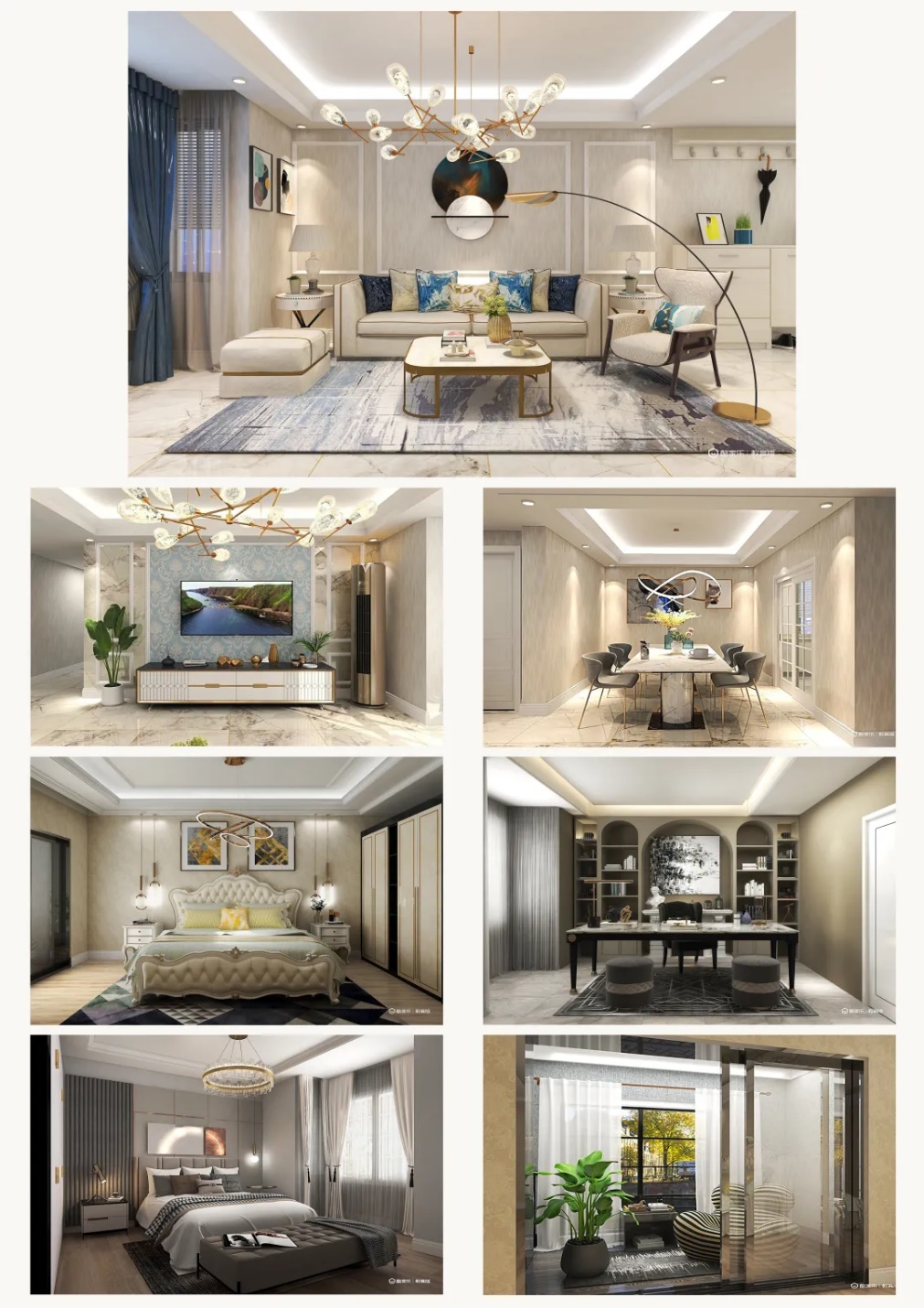 本次设计为一个居室空间,可以容纳一对夫妻和一个成年孩子。为了能使男女主在繁忙且快节奏的生活中感受到家庭中的温暖,整体采用了舒适的暖色调,设计风格运用了轻奢风,硬装布局中体现比较现代而简单的线条为基础;装饰布置上大量使用了简洁大方,低调品质的物品,辅以大理石、金属、玻璃、镜面等元素来缔造整个空间的设计和运用米色、驼色、蓝色等轻快且优雅的基调来进行色彩搭配。