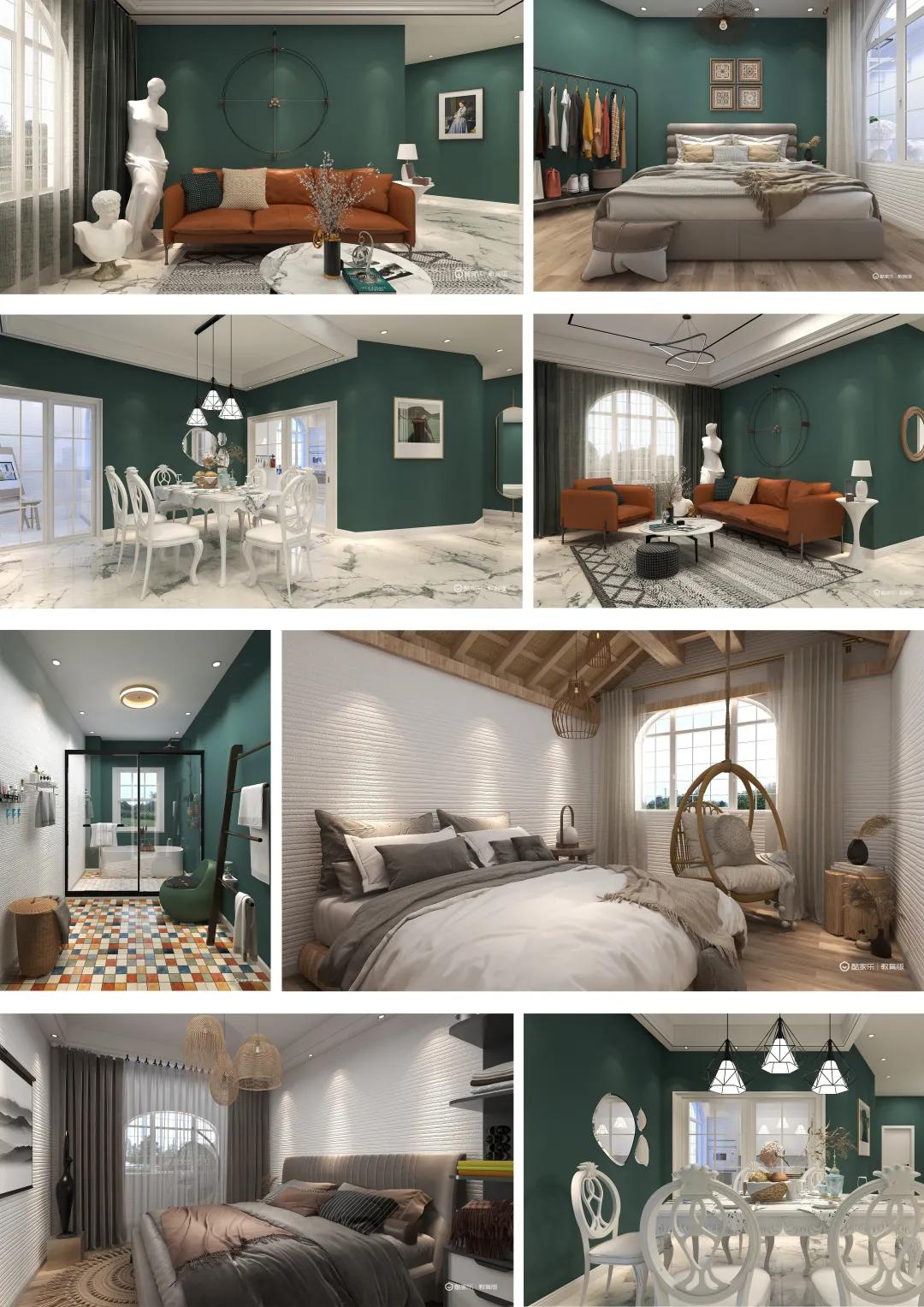 波西米亚风格的精神内核是反叛、嬉皮、自由。此次选用了绿色、白色为主色调。门口做成有斜度的过道,一方面是引导人流,另一方面拓宽了电视墙的看面,同时空间也多了一点变化;餐厅与厨房一体,玻璃推拉门视野通透,也很好的隔绝了油烟;卧室选用原木色、灰色等低纯度色系营造出良好的睡眠环境:阳台处采光较好,作为晾晒区及画室,门口一间房做了电影房,厕所地砖采用马赛克撞色搭配,给人强烈的视觉冲击感,同时也做了干湿分离。