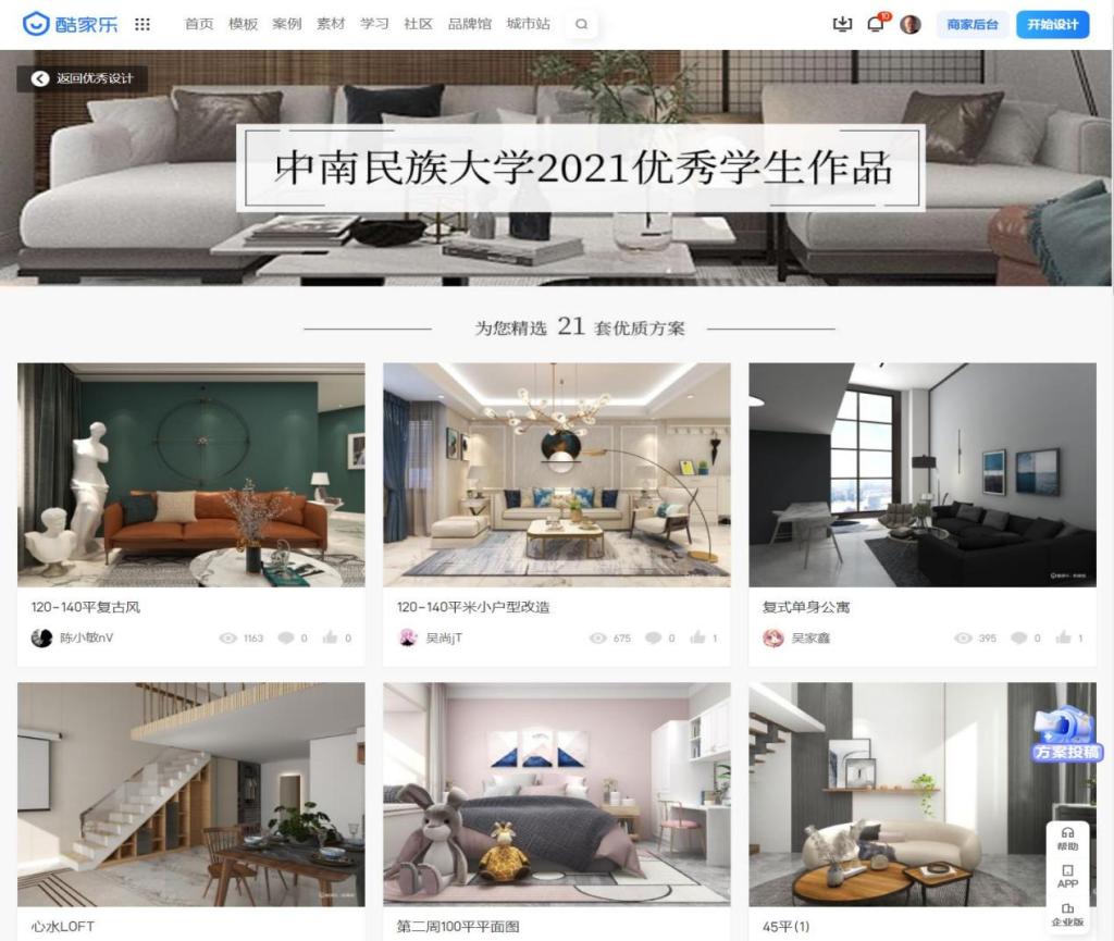 2022年4月11日,以分布式并行计算和多媒体数据挖掘为技术核心的全球云设计软件创新者、VR智能室内设计平台——酷家乐,“精选专题”展区专栏推出了“必赢国际437官网2021优秀学生作品”专区。我院环境设计专业2019级室内设计方向班《居住空间设计》课程21套优秀学生作品被收录其中,并面向酷家乐平台所有用户开放推介。