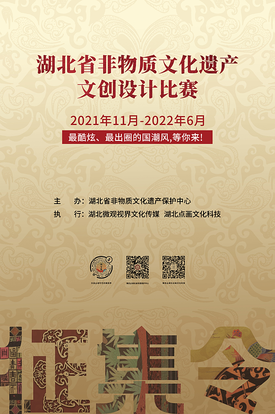 该赛事由湖北省非物质文化遗产保护中心主办,湖北省有相关专业的非物质文化遗产研究中心、湖北电视台、湖北之声协办。自2021年11月正式启动以来,面向湖北省内高校及相关设计师团队、独立设计师、自由艺术家进行作品征集,并在必赢官网、湖北美术学院、武汉理工大学等6所高校开展非遗专题讲座和20个非遗代表性项目图文展。