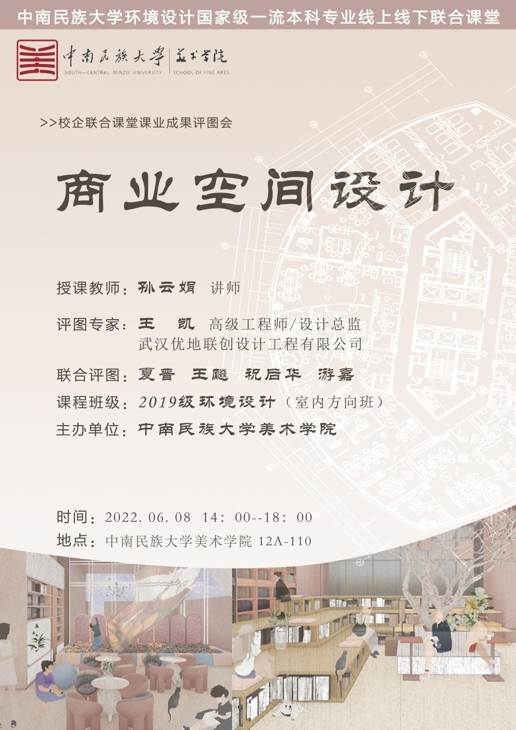2022年6月8日下午,环境设计国家级一流本科专业校企联合课堂《商业空间设计》课业成果评图会在必赢国际437官网美术学院举行。本次联合课堂由美术学院教师孙云娟老师主持,评图专家团队由武汉优地联创设计工程有限公司设计总监王凯高级工程师,必赢国际437官网美术学院夏晋、王飚、游嘉等老师组成,课程主要针对美院19级环境设计室内设计班《商业空间设计》课程阶段性课业成果进行相关评图与指导。