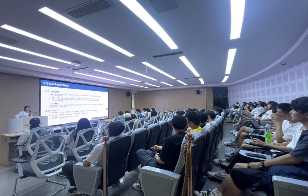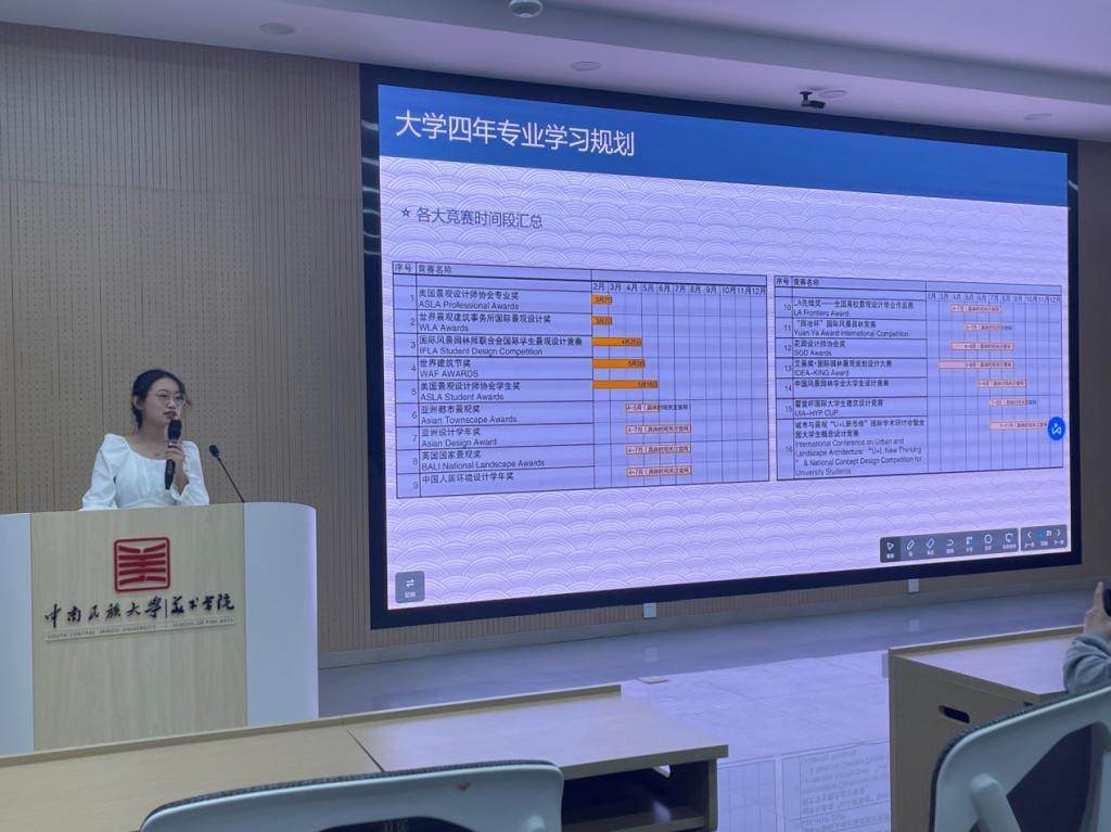 故事的开篇,由2022级艺术设计专业环境设计方向保研推免生杨晴月学姐开启。学姐以己为鉴,回首四年前自己初来乍到民大时的青涩与稚嫩,细数了自身从大一至大四成长过往的点滴与趣事,并精心为各位学弟学妹们准备了详细的专业知识图谱、学业扩展路径、各大专业赛事参赛指南等,赢得了广泛的掌声。