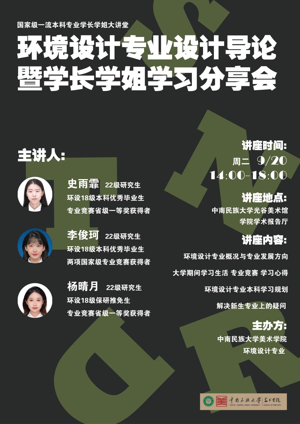 2022年9月20日下午,一场由必赢国际437官网国家一流本科专业建设点组织的“环境设计专业设计导论暨学长学姐分享会”在光谷美术馆三楼学术报告厅如火如荼地展开。本次分享会由环境设计专业负责人夏晋老师主持,并特别邀请了本专业应届毕业,且继续在校攻读硕士研究生的李俊珂、史雨霏、杨晴月等3位优秀学姐,以她们自身的求学经历为蓝图,学业的亲身感悟为蓝本,为在场的60位2022级环境专业萌新们分享了一场关于“民大环设的学习生活故事”。