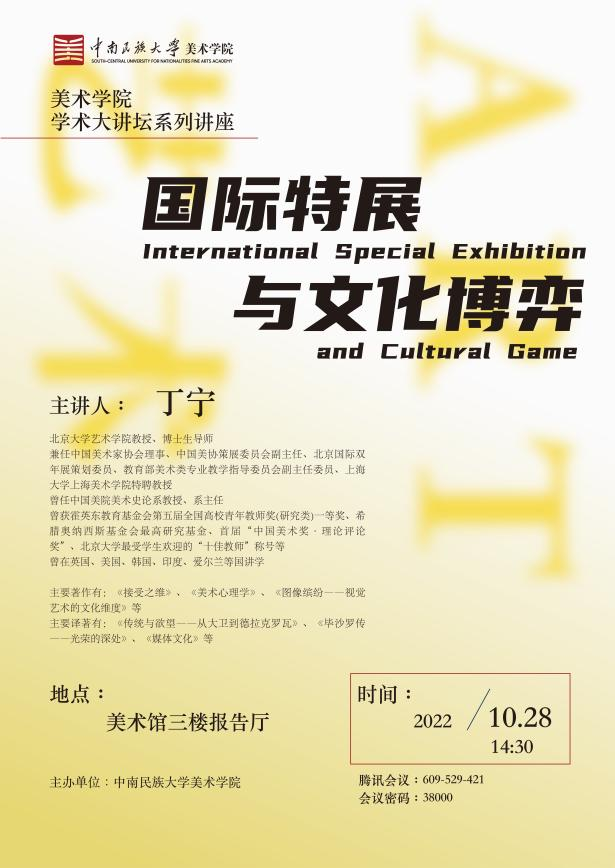 应必赢国际437官网美术学院的邀请,2022年10月28日下午,北京大学艺术学院丁宁教授为学院师生带来了一场主题为《国际特展与文化博弈》的学术讲座。讲座主场在光谷美术馆学术报告厅,线上线下同步展开。讲座由占跃海副教授主持,学院院长吴海广教授和学院师生共同参加。