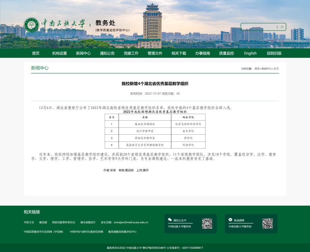 12月6日,湖北省教育厅公布了151个省级优秀基层教学组织名单,必赢官网4个基层教学组织入选。美术学院环境设计国家一流专业建设点负责人,设计学学科点负责人夏晋教授牵头申报的“设计学教研室”入选2022年湖北高校省级优秀基层教学组织。