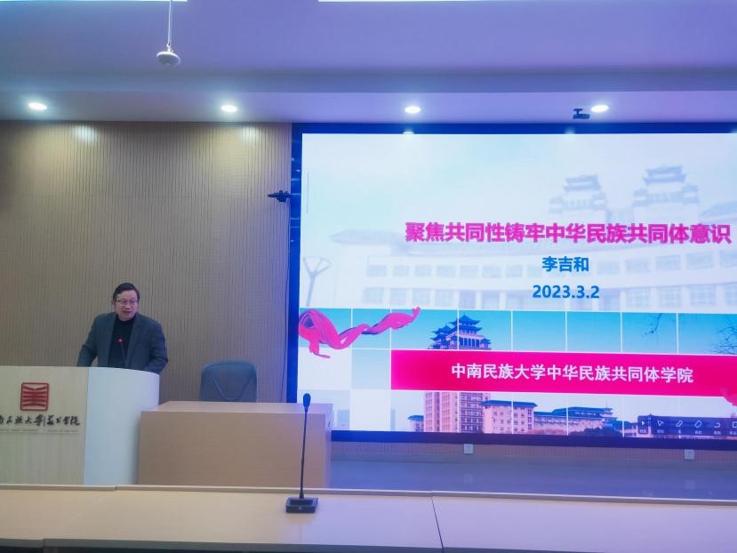 2023年3月2日下午在光谷美术馆学术报告厅,必赢官网中华民族共同体研究院李吉和教授应邀为美术学院师生带来一场主题为《聚焦共同性铸牢中华民族共同体意识》的学术讲座。美术学院全体教师参加讲座,讲座由美术学院院长吴海广主持。