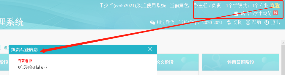 *在页面右上角,展示了系主任负责的专业信息,点击可以查看当前用户具体负责那些或者那个专业