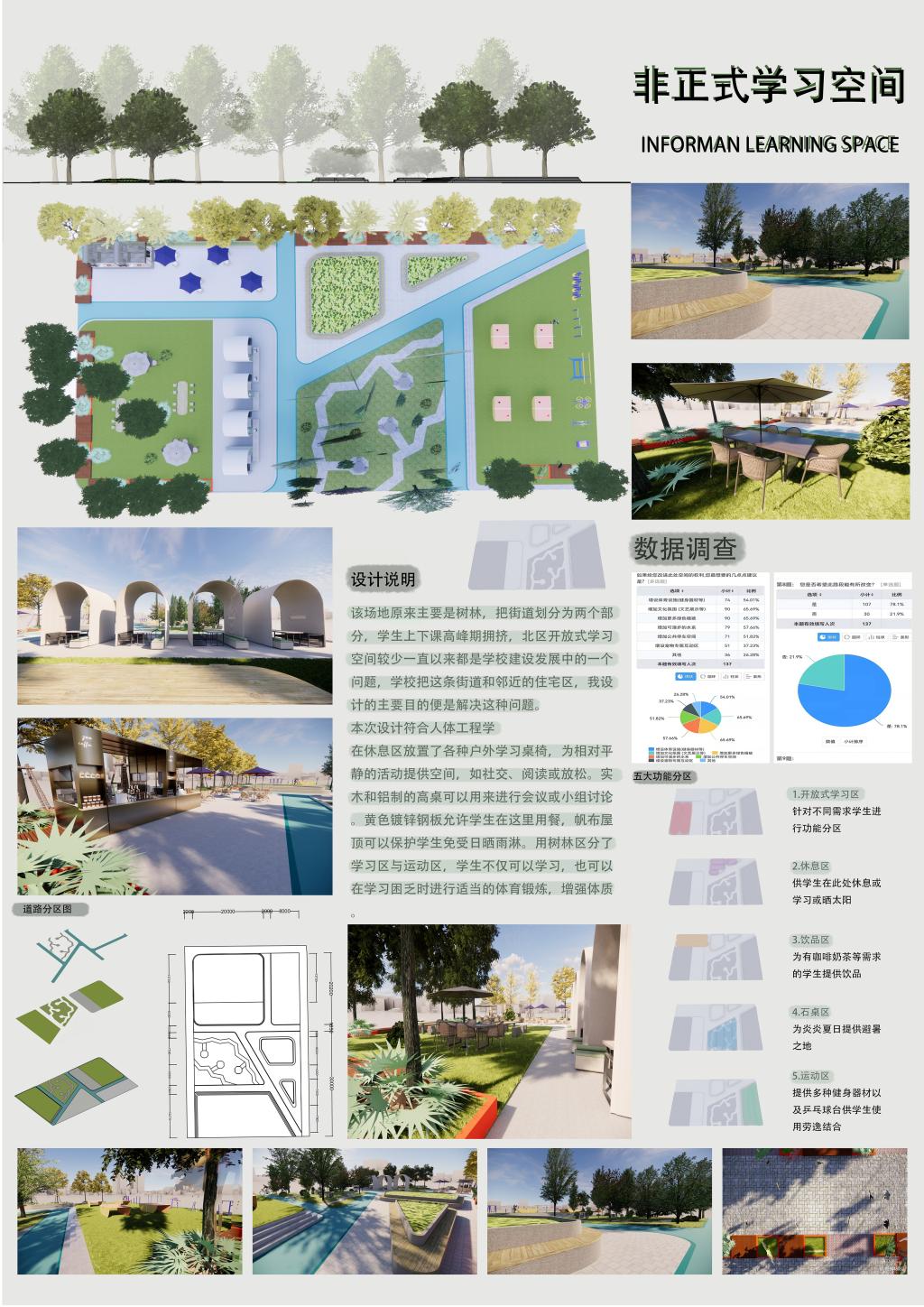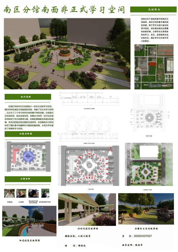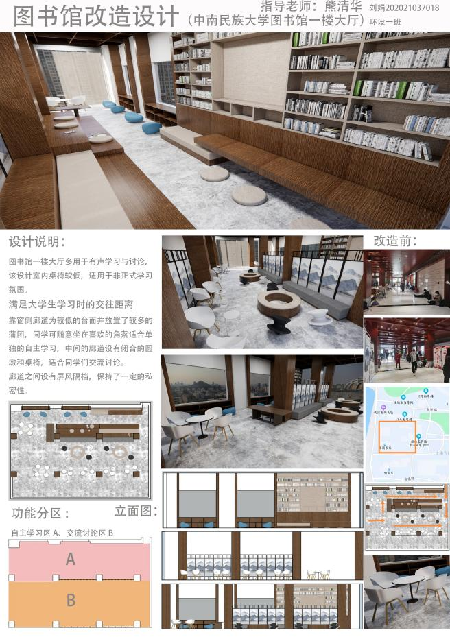 本次设计改造的地方是南区分馆南面的空地,将此区域一分为三,三个部分,一是可以进行讨论交流的讨论空间,二是阳光充足的自习空间,三是安静的单人学习空间,各个区域各有所职,满足当代大学生对非正式交流空间的学习需求。