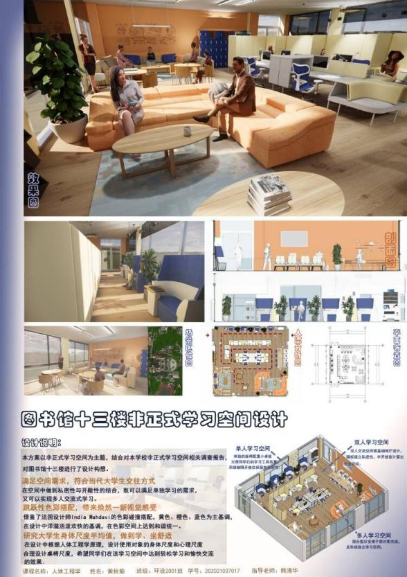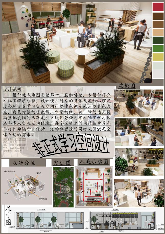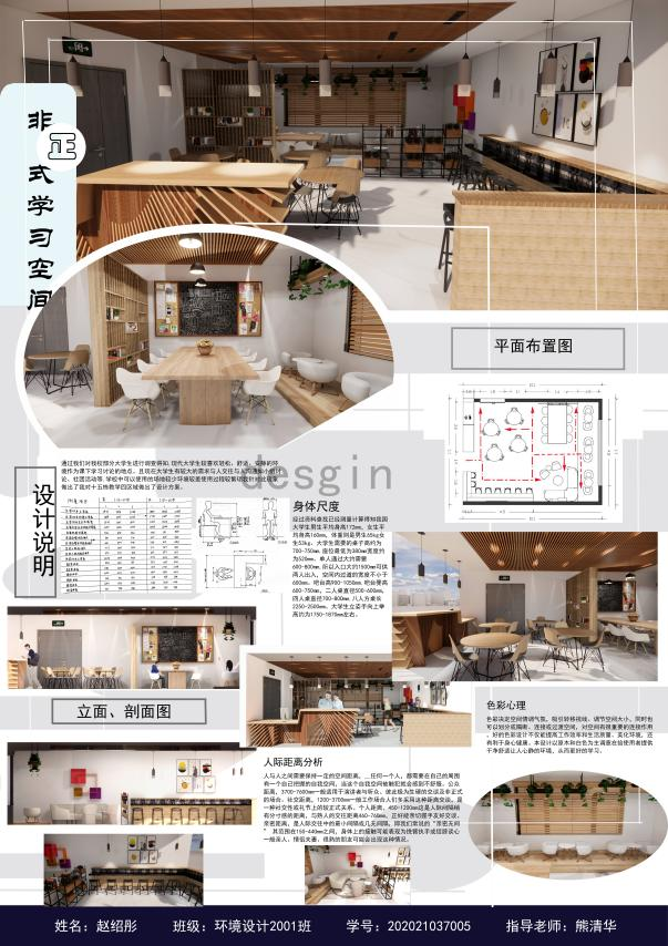 本设计旨在打造一个温馨、放松的非正式学习空间,本设计符合人体工程学原理,设计适用对象的身体尺度和心理尺度合理设置学习交流空间;在配色上运用了以黄色为主白色为辅的暖色调,少量红、黄、绿的运用提高整体氛围的活跃度;装设材料是以木材为主;区域划分分为单人独坐学习区和多人互动交流区,每个区域间用绿植和吊灯作为隔断,在保持一定私密性的同时又能满足全体互动的需求。