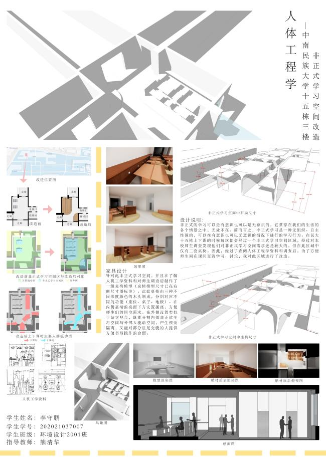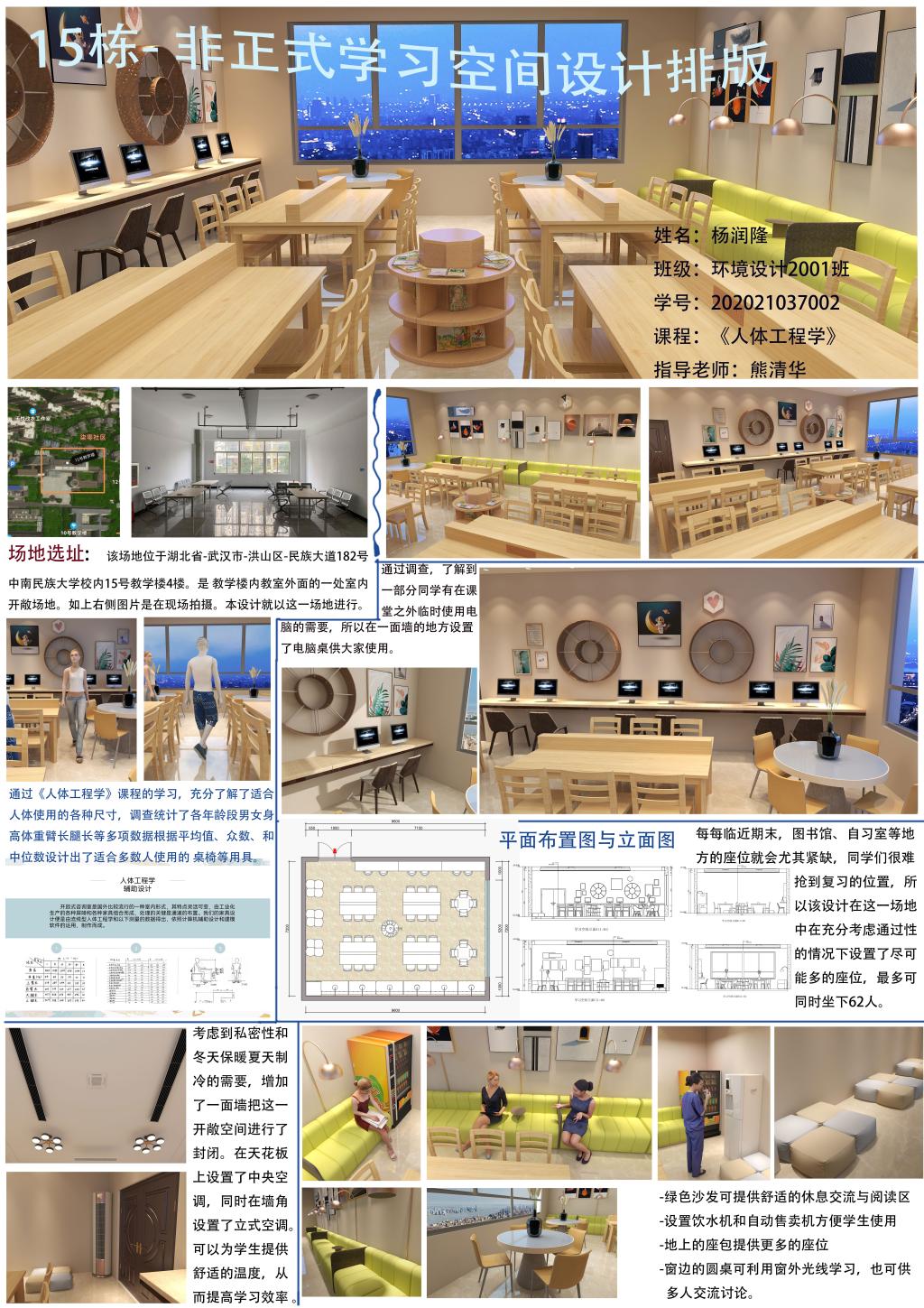 本次非正式学习空间选取了位于十五栋三楼西侧楼梯口处,在考虑了师生需求进行了功能整合、完善。并在此空间中设计了一套定制家具,家具的设计也考虑了人体比例和师生心理使其尽可能提供最佳服务。