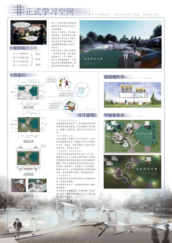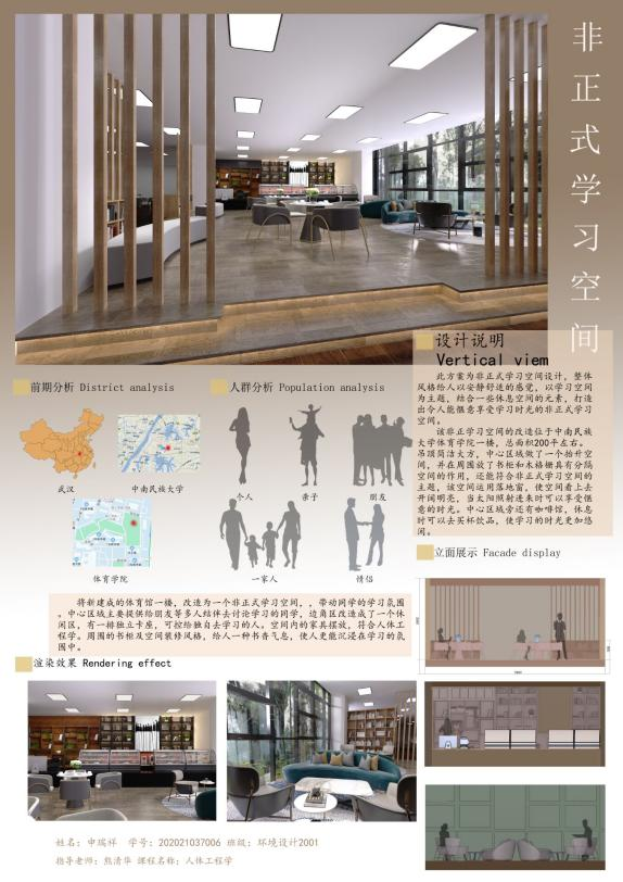 此方案选址于大礼堂旁新建的体育馆一楼大厅,将其改造为一个非正式学习空间。整体风格给人以安静舒适的感觉。划分了主要功能区,整体做了抬升空间为主要学习区域。运用落地窗使空间开阔明亮。桌椅摆放符合人体工程学。设计风格遵循心理学,使人的心理更加放松。