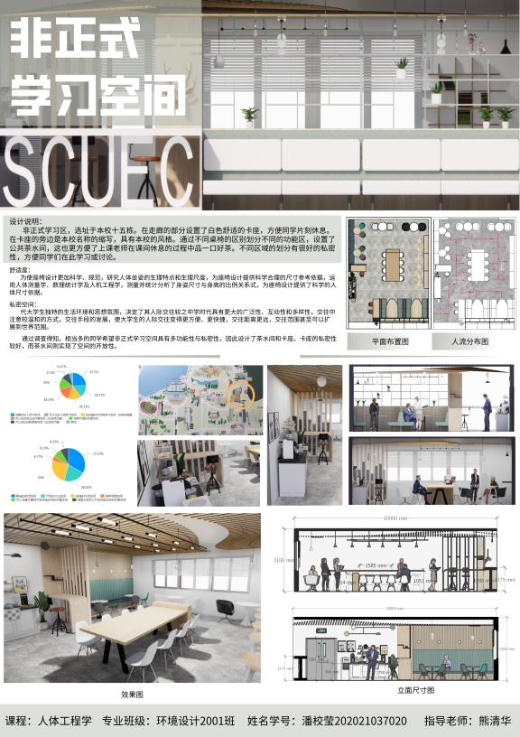 室内非正式学习空间,选址于本校十五栋教学楼。在走廊的部分设置了白色舒适的卡座,方便同学片刻休息。卡座的旁边是本校名称的缩写,具有本校的风格。通过不同桌椅的区别划分不同的功能区,有单人吧台、两人休闲桌、三人几以上交流区等等。不同区域的划分有很好的私密性,运用人体测量学和人机工程学,使座椅更加科学和规范。方便同学们在此学习或讨论。设置了公共茶水间,实现了空间的开放性,推动了交流空间的互动性和多样性。