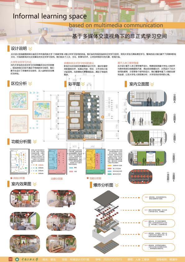 此次设计的选题围绕湖北省武汉市必赢国际437官网 15栋教学楼-4楼公共学习空间的改造。我们旨在将其改造成非正式学习空间,供民大学生们课前课后学习。整体的设计我们基于了多媒体影视文化,打造成影视文化交流复合式非正式学习空间。我们结合了人文,文化,影像与艺术,公共空间等多元性元素,基于此设计了多媒体交互空间,注入全新的交往模式与体验,宏观打造。