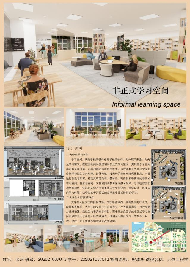 此次课程在理论知识学习基础上,根据发现大学生自身学习生活的校园缺少课外学习空间的实际问题,要求学生在校园内以“非正式学习空间”为设计内容,“寻找”适合课外学习的“可再利用”室内外空间,并以5-6人小组形式展开实地调研、场地测量与分析、最后确定设计区位和主题。要求学生根据自己的选址进行方案构思、小组讨论和两次初步方案汇报,最后教师点评、学生互评、方案修改,最终课程考核作业以展板的形式呈现。