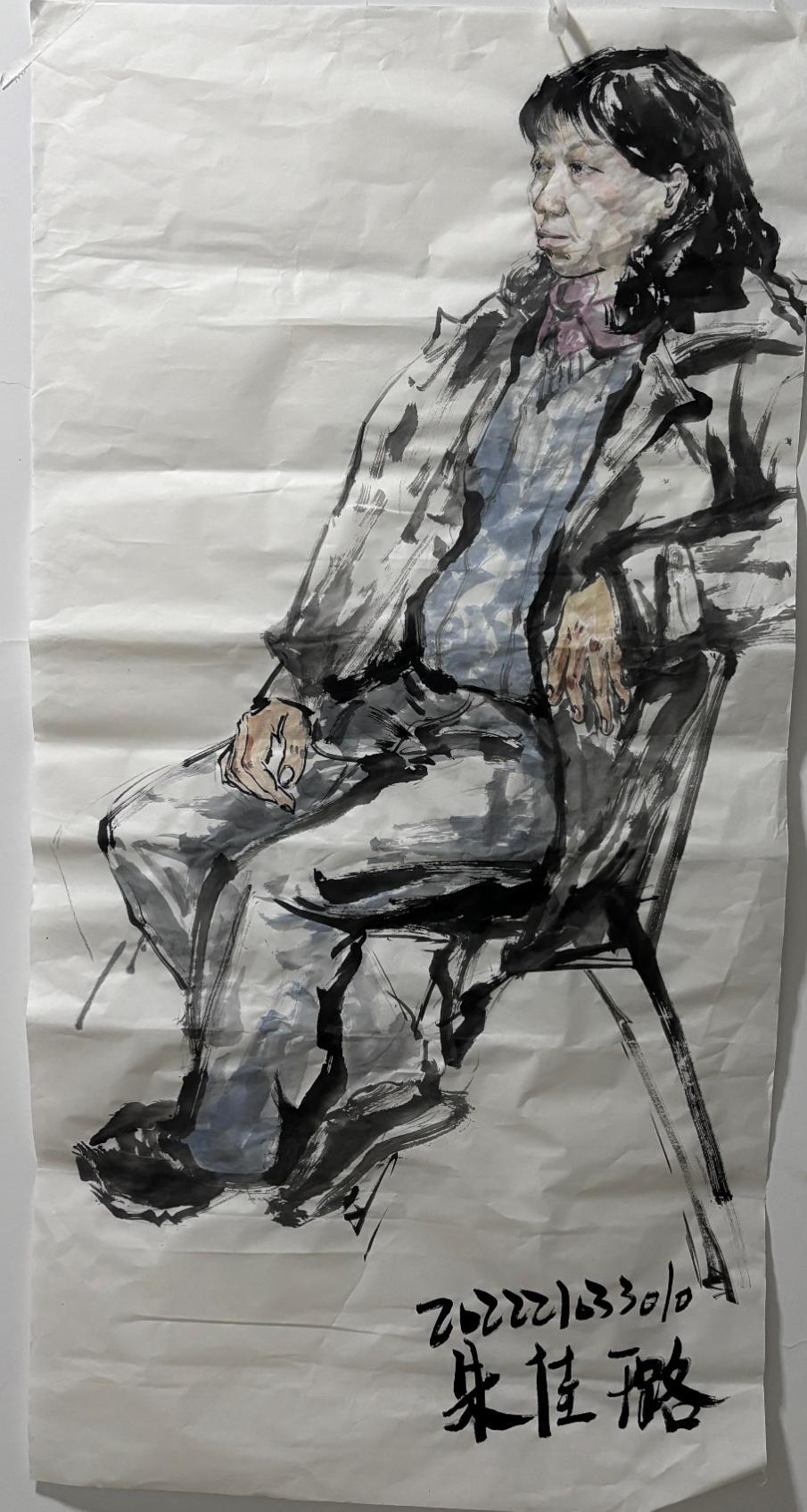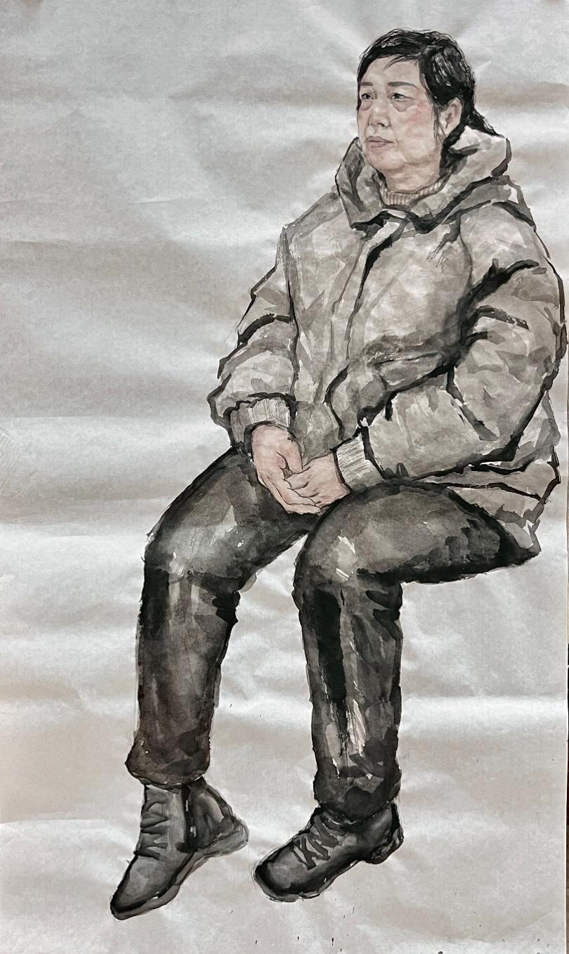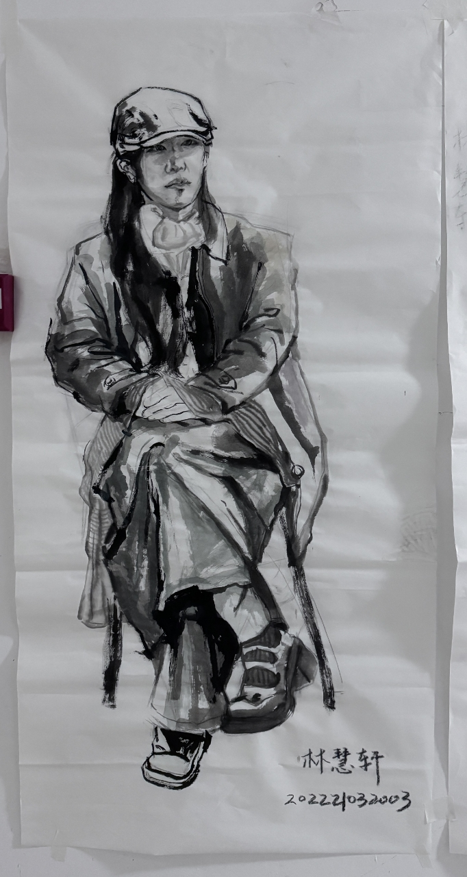 上了毛笔人物写生这门课,让我们受益颇多。毛笔人物画写生注重笔墨的运用,通过线条的粗细、浓淡、虚实来表现人物的形态和神韵。陈岱老师的教学让我们深刻体会到这一艺术形式独特的魅力与价值,我们在实践中我们学会了如何观察人物的特征,并尝试将其转化为笔墨语言,学会如何运用笔墨色彩的浓淡、干湿来表现人物的神态和气质,学会了运用不同的笔触和墨色来表现人物的不同质感和情绪。从浓淡干湿,到快慢转折,每一次落笔都需要精心斟酌,以求与对象相呼应。这种技巧的训练,让我们在表达人物肖像时能更加自如地使用工具去驾驭画面,让作品流露出丰富的层次和变化,这对提升我们的绘画技巧有很大帮助。