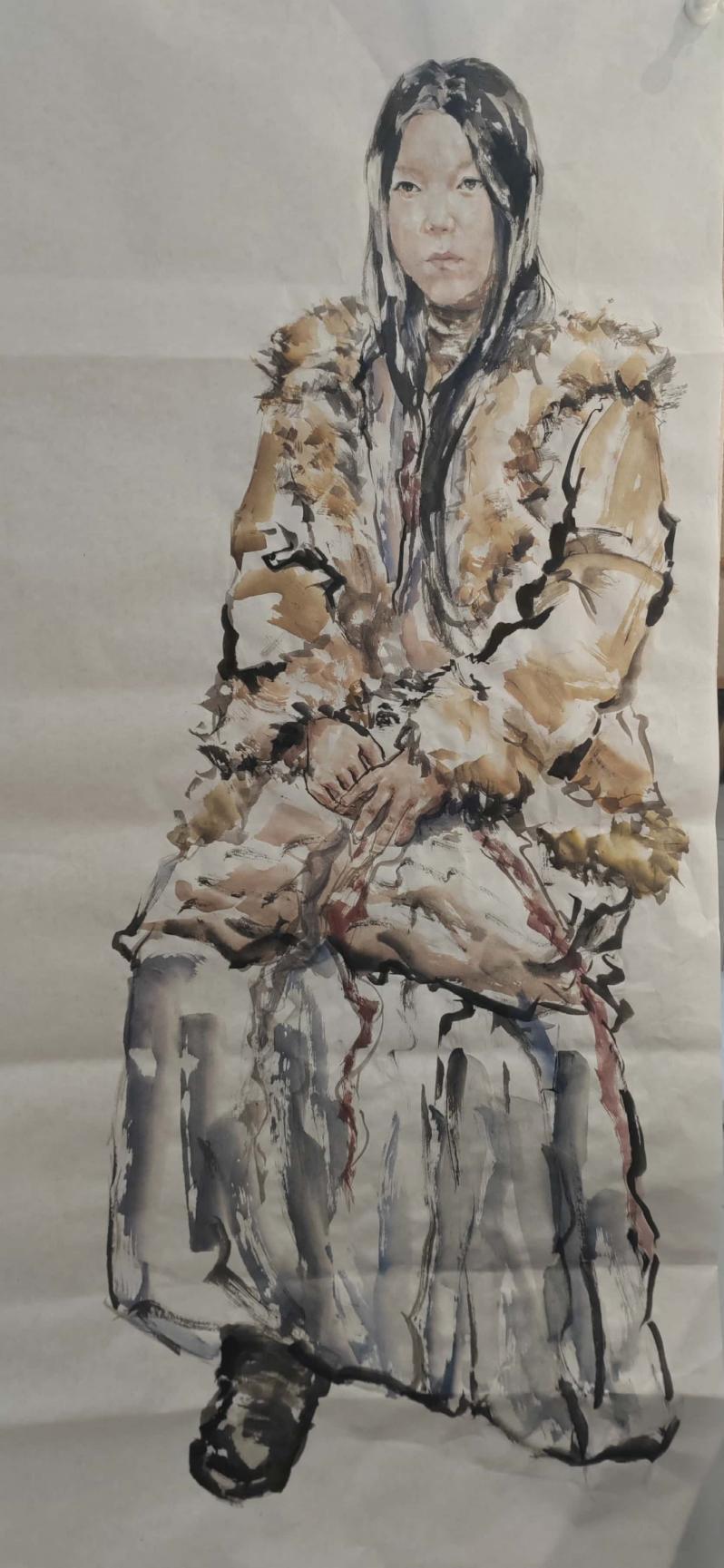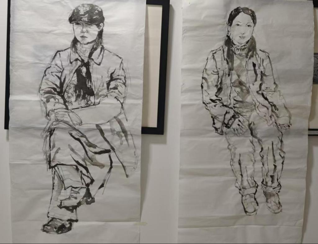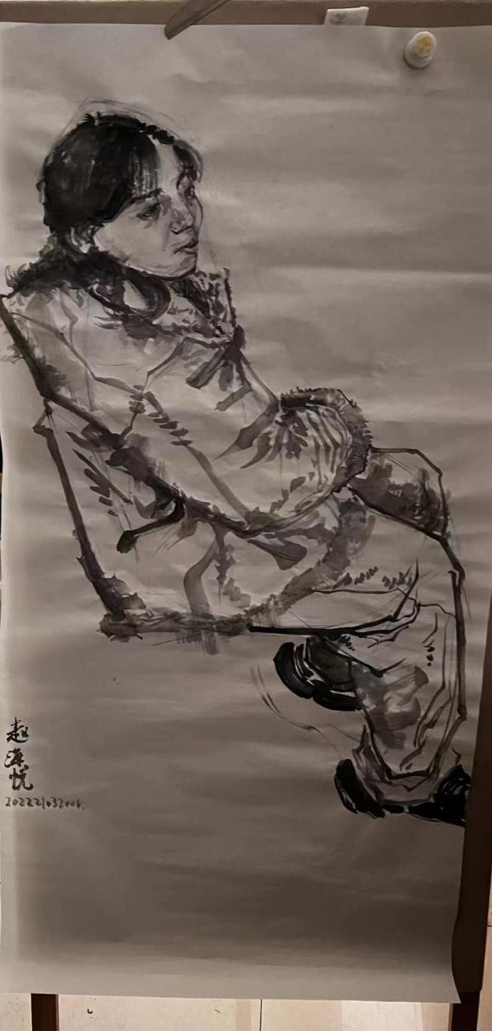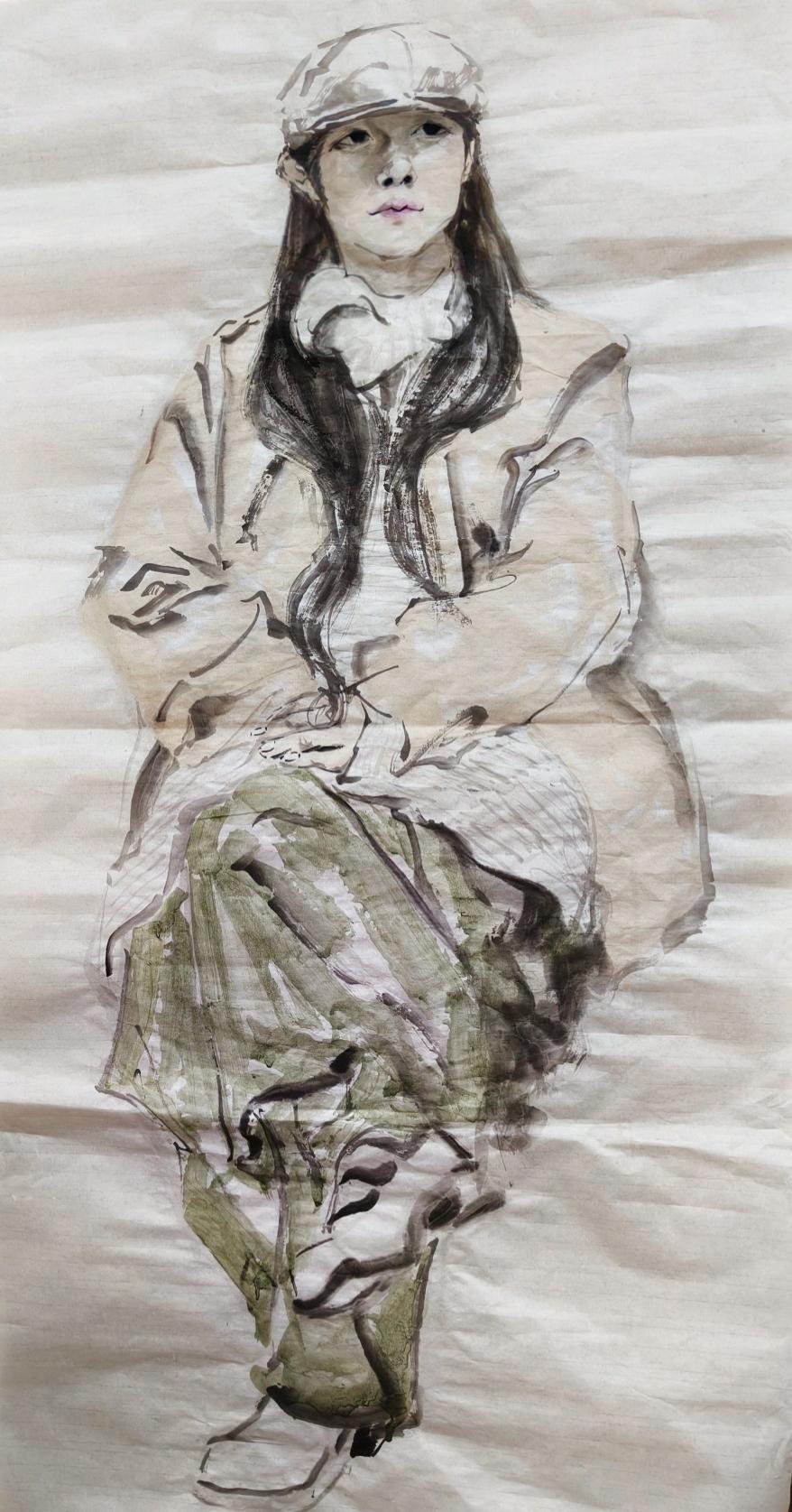 上了毛笔人物写生这门课,让我们受益颇多。毛笔人物画写生注重笔墨的运用,通过线条的粗细、浓淡、虚实来表现人物的形态和神韵。陈岱老师的教学让我们深刻体会到这一艺术形式独特的魅力与价值,我们在实践中我们学会了如何观察人物的特征,并尝试将其转化为笔墨语言,学会如何运用笔墨色彩的浓淡、干湿来表现人物的神态和气质,学会了运用不同的笔触和墨色来表现人物的不同质感和情绪。从浓淡干湿,到快慢转折,每一次落笔都需要精心斟酌,以求与对象相呼应。这种技巧的训练,让我们在表达人物肖像时能更加自如地使用工具去驾驭画面,让作品流露出丰富的层次和变化,这对提升我们的绘画技巧有很大帮助。
