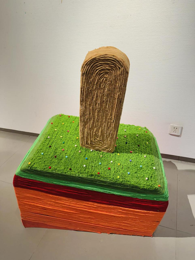作品介绍:这件艺术装置以夏日为灵感。底部多彩层叠似大地,绿色表层如茵茵草地,点缀彩点仿若夏日繁花。上方冰棍造型醒目,纹理细腻。它将夏日的清凉与大地生机融合,借冰棍这一夏日符号,唤起人们对夏日惬意、舒爽时光的美好联想。