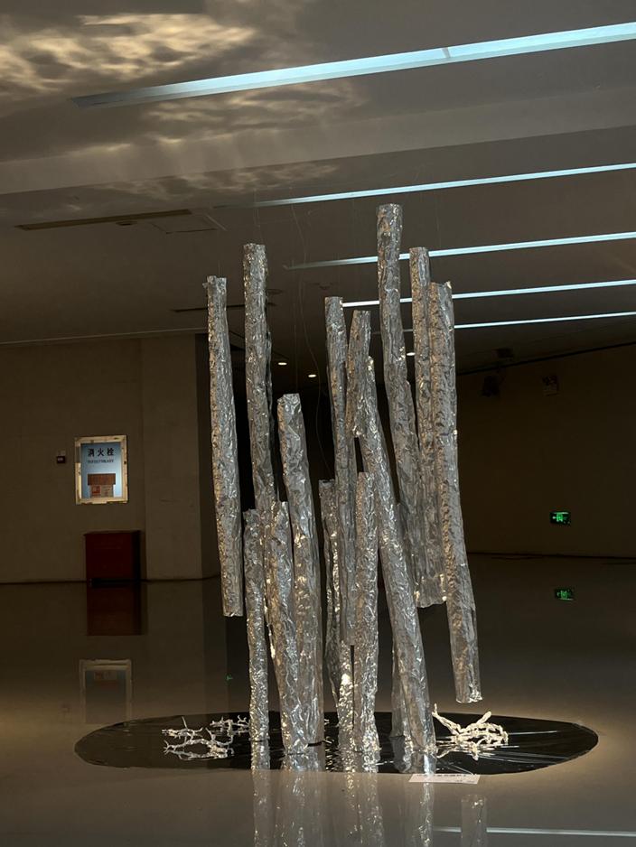 作品介绍:铝箔材质的自然树皮纹理与反射镜面结合的装置,通过多维度呈现