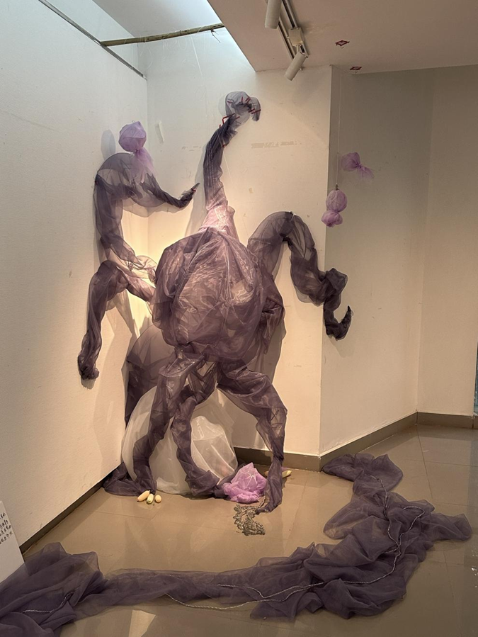 作品说明:珍珠章鱼生活在海平面三千米以下的海底,由于环境温度过低,珍珠章鱼的卵需要十年才能发育完成,为了缩短孵化时间,雌性珍珠章鱼会在产卵期前往海床的裂缝的聚居地,利用热泉的温度孵化自己的卵,在安顿后她们不会再离开,也不再进食。当最后一批珍珠章鱼宝宝离开,珍珠章鱼妈妈的生命也也走到了尽头。该作品用欧根纱和铁丝组成,呈现出雌性珍珠章鱼在繁衍后代时燃烧生命的模样。