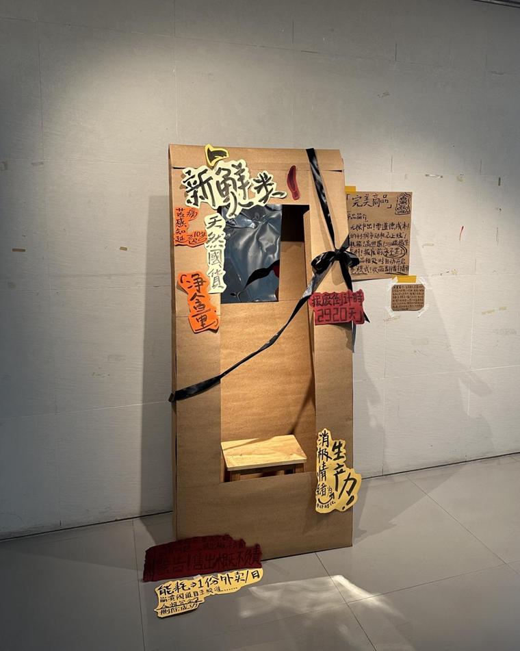作品说明:大型牛皮自带构建一个半开放场域,内壁镜面将倒映的人类变成商品,以夸张激进的语言形容此件商品,暗讽资本操纵消费主义对整个世界进行商品分类,物化人类自我、标签化、以及社会对于人力资源的人文关怀上的漠视。同时观众试图看清镜中倒影时,会发现倒影扭曲变形,直指这种完美商品本质是无法达到的工作机器是为资本打造的幻影。引发对自我价值与人性的思考。