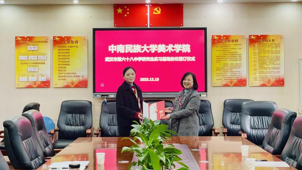 座谈会后,双方签订合作协议。邹反修书记为武汉市第六十八中学研究生实习基地授牌,并为相关基地教师颁发了指导教师聘书。她表示此次与武汉市第六十八中学建立研究生实习基地,不仅加强了学院与校地周边中学的交流,对于学生来说为他们毕业实习实训提供了宝贵的经验。在此基础上,我们期待未来有更多这样的机会。可以通过与武汉市第六十八中学的合作,加强学校与学校之间的联系,为艺术教育事业作出更大的贡献。