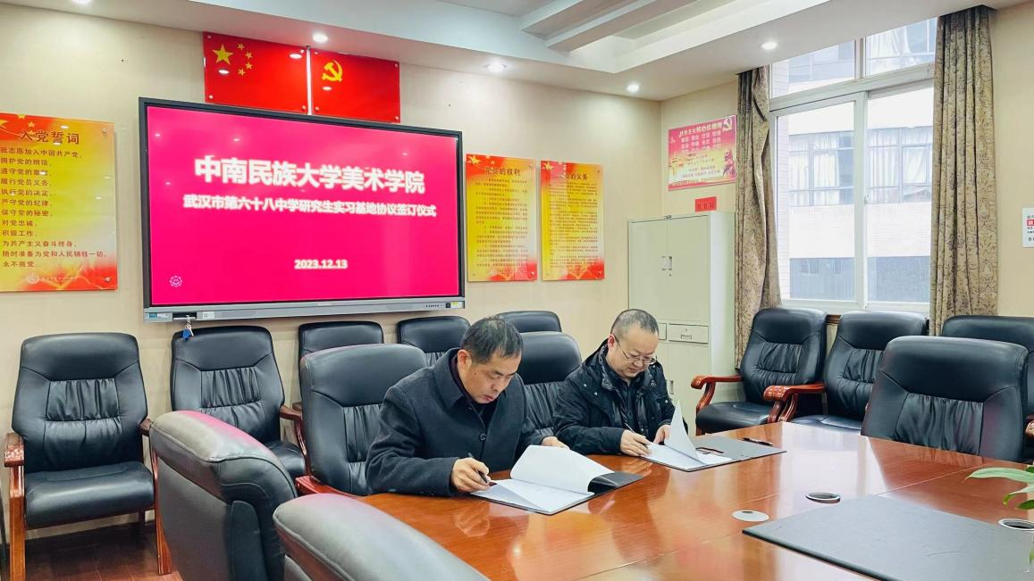 2023年12月13日,必赢国际437官网美术学院党委书记邹反修,副院长夏晋,研究生辅导员张丁,及部分研究生学生代表共赴武汉市艺术特色高级中学武汉市第六十八中学开展访企拓岗,校地合作交流活动,并进一步就研究生实习实践基地合作达成协议签约。