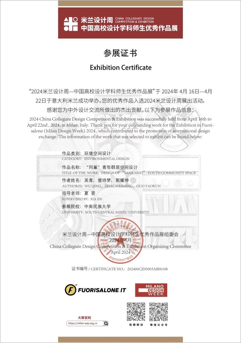 2024年4月16日至22日,备受瞩目的意大利米兰设计周,迎来了中国高校设计学科师生优秀作品展。近200件来自中国高校师生的优秀设计作品齐聚米兰国际艺术中心盛大展出。其中,由美术学院夏晋教授指导的研究生团队吴青、曾玮梦、郭耀坤设计作品《“同巢”青年群居空间设计》成功入选该项展出活动。此次展览作为2023米兰设计周官方主题活动之一,再次将中国设计的魅力展现在全球舞台上,与世界顶尖的设计师和作品交流碰撞。