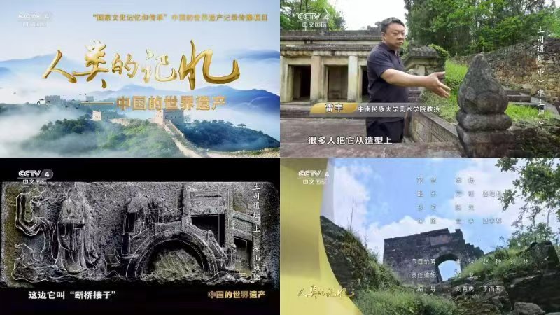 2024年8月15日晚,《人类的记忆——中国的世界遗产》纪录片在中央电视台中文国际频道(CCTV-4)播出。该片分三集专题介绍了中国的世界文化遗产——“土司遗址”,生动纪录了历史上元、明、清三朝在西南少数民族地区实施的“齐政修教”“因俗而治”的土司制度和湖北咸丰唐崖土司城、湖南永顺老司城、贵州遵义播州海龙屯的历史文化遗存。在该纪录片的拍摄过程中,美术学院师生参与了“深山城堡”和“率土归心”两集的拍摄工作,为该片对唐崖土司城遗址的解读做出了贡献。