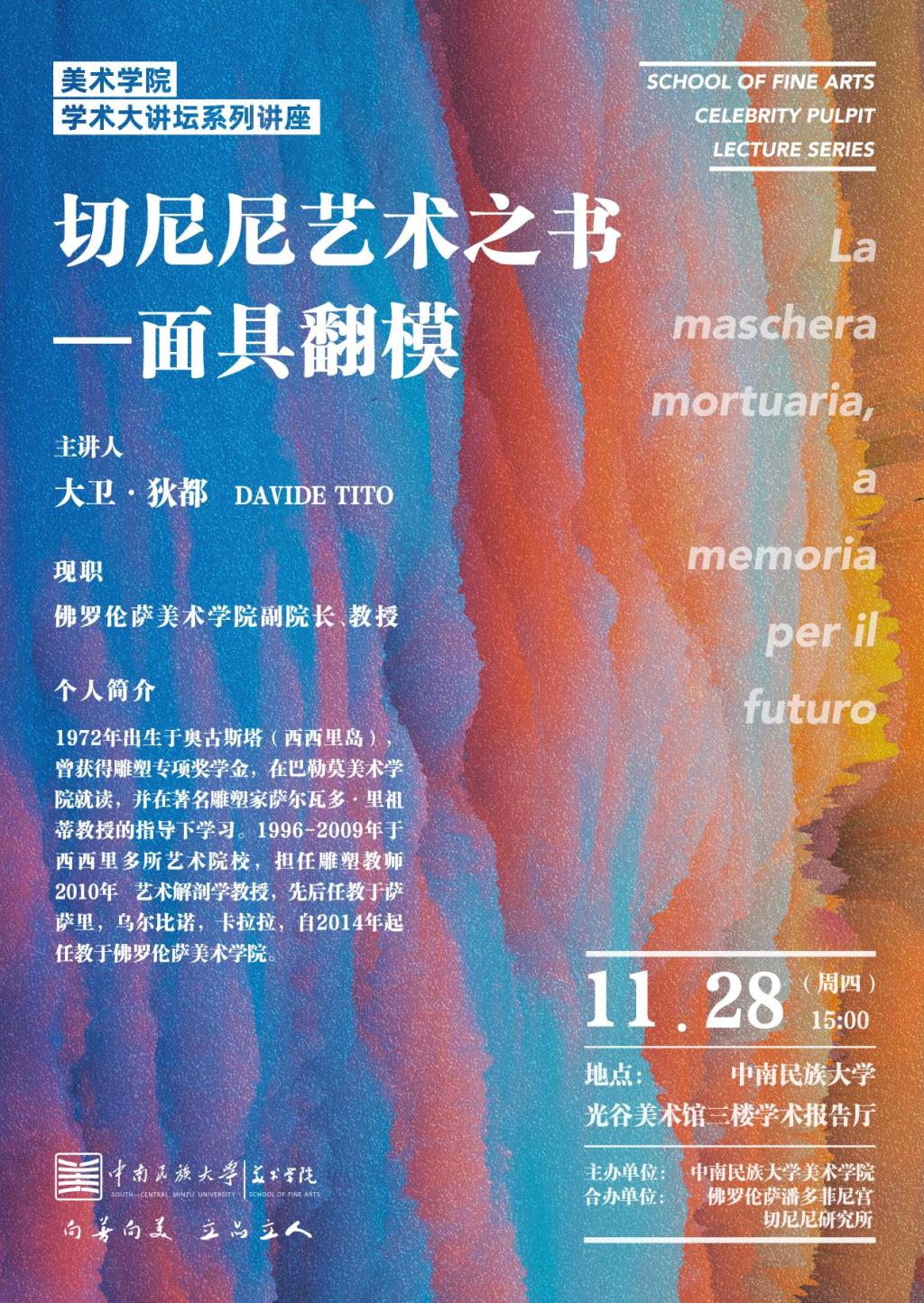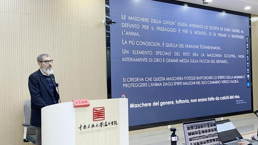 DAVIDE TITO教授对美术学院邀约表达了感谢,并对学院的艺术氛围与学术热情表示赞赏。他以《切尼尼艺术之书——面具翻模》为主题,详细介绍了意大利画家切尼诺·切尼尼在15世纪初撰写的绘画论著《艺术之书》及其核心思想,重点探讨了面具文化以及面具翻模材料技法,阐述了该书对于对于欧洲绘画艺术史及中世纪绘画技法研究的重要意义,并阐释了面具翻模这一欧洲艺术传统技术在真人翻模技术、石膏人像制作等方面的重要作用。