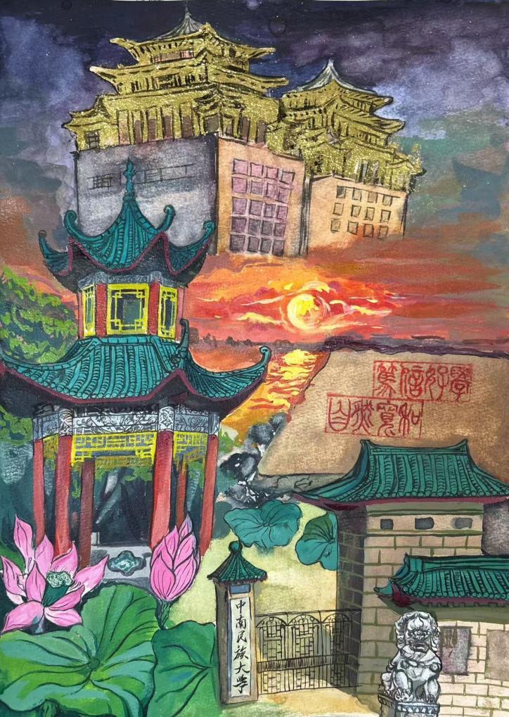 浓墨重彩,描绘出日出日落的绚丽;黑白剪影,陈述出民大历史的积淀;线条勾勒,书写出校园景色的轮廓;同学们发挥专业优势,采用多种艺术形式和表现手法,展现了民大丰富多彩的魅力,既有自然的瑰丽,又有历史的厚重,更有校园独特景色的韵味,得益于同学们的积极响应与精彩创作,学院收获了一批有创意、有表达、有情感的优秀作品,现已在美术学院一楼展厅供师生共赏。