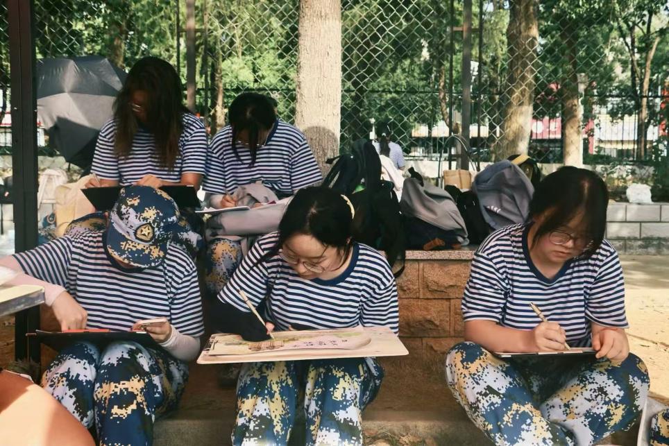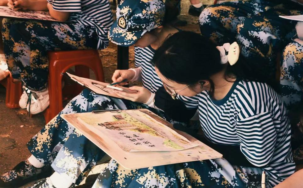 2024级的百余名新生热情高涨,纷纷投身其中,他们悠然放慢步伐,在双子塔下,在南湖园里,民大校门前……在学校的各个角落,初入校园身着迷彩服的同学们在军训的闲暇时间,与校园的每一寸草木开展对话,与民大的每一幢建筑深入接触,与校园的每一位同学亲切交流,用画笔细腻勾勒出自己心中对民大的第一印象。远远望去,他们专注作画的身影给民大增添了一番别样的色彩。