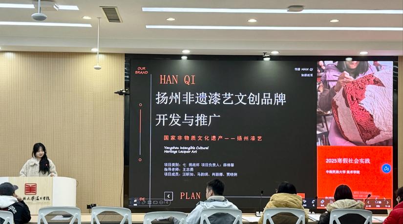 27支队伍围绕实践目的、实践过程、调研成果及成员收获等内容进行了4分钟的PPT展示汇报。“邗漆 HAN QI团队”聚焦于非物质文化遗产——扬州漆艺,他们致力于创作出新时代的非遗年轻文创品牌,为漆艺注入新鲜活力,希望更多人认识并喜爱扬州漆艺非遗文化;“筑梦影戏社”深入了解学习皮影文化后,在指导老师的带领下组织了皮影制作工坊,并走入小学生群体中宣传科普,让皮影文化走进更多人的生活,让这一传统艺术在新时代绽放更耀眼的光芒;“三花之旅”在本次寒假期间去到了湖北英山,更加全面地了解并学习关于缠花的历史故事与制作方法,感受非遗文化之美,推动缠花文化的传承与发展;“锦韵数探·西兰卡普实践队”深入了解了西兰卡普非物质文化遗产的传承现状,帮助其调查非遗产品的市场需求和消费者偏好等,助力西兰卡普的推广,让大众更加了解西兰卡普。