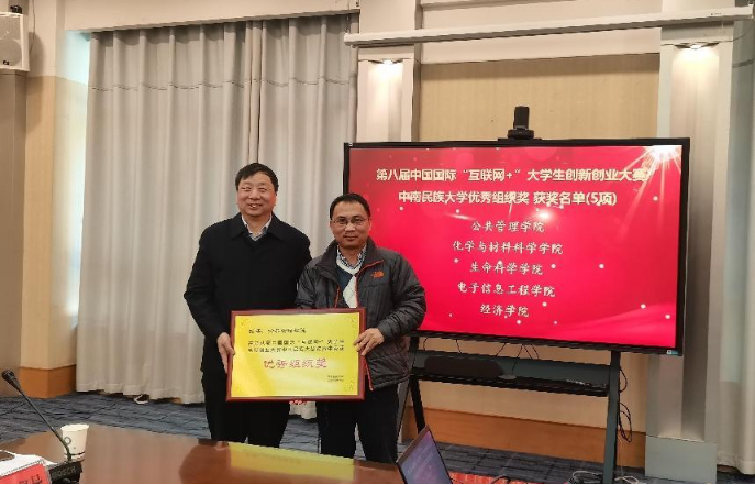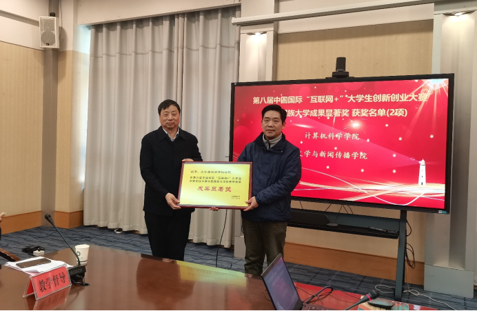 会上,举行了学校第八届“互联网+”大学生创新创业大赛颁奖仪式,杜冬云为公管学院、化材学院、生科学院、电信学院、经济学院等5个学院颁发了“优秀组织奖”,为计科学院、文传学院等2个学院颁发了“成果显著奖”。
