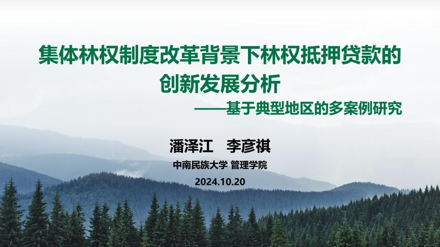 潘泽江教授指导的研究生3篇学术论文——李彦祺的论文《集体林权制度改革背景下林权抵押贷款的创新发展分析》、余长轩的论文《长江经济带省份绿色发展效率及其影响因素研究》、黄浩的论文《集体林权制度改革背景下林下经济发展路径研究》入选论坛。李彦祺的论文围绕“林权抵押贷款创新发展”主题,结合生态产品价值实现、融资风险管理、市场化林权收储担保与抵押品核算评估等问题进行了现场汇报。