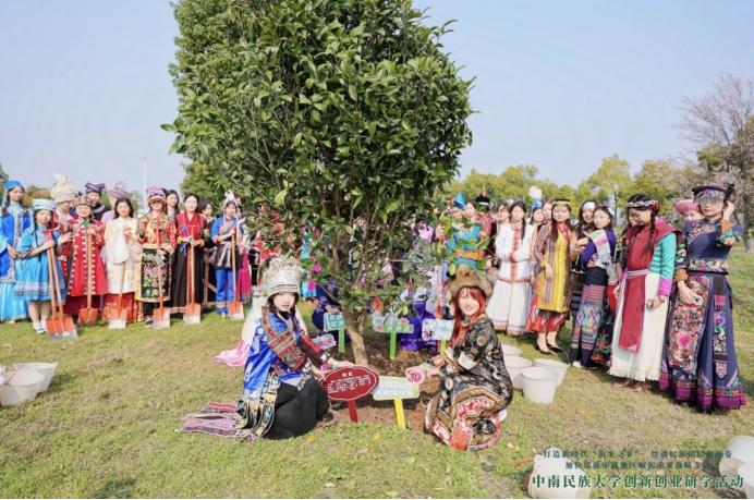 共植“同心”树,民族团结情更浓。各民族师生代表共同种植了一棵“同心”之树。通过挖坑、扶树、培土、浇水等一系列工序,象征着民族团结和农业可持续发展的桂花树在园区内扎根。