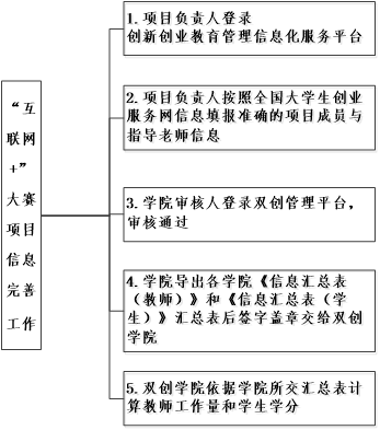 为顺利开展第八届“互联网+”大赛的指导教师课时补助和学生创业学分认定工作,确保项目信息的准确性,现通过创新创业教育管理信息化服务平台启动“互联网+”大赛项目信息完善工作,具体安排如下: