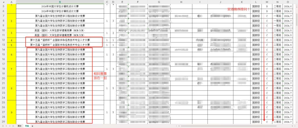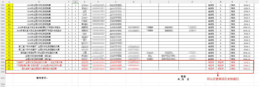 附件1相同赛事汇总在一起,并按照获奖等级降序的方式进行排列,待认定赛事放在表格最后。