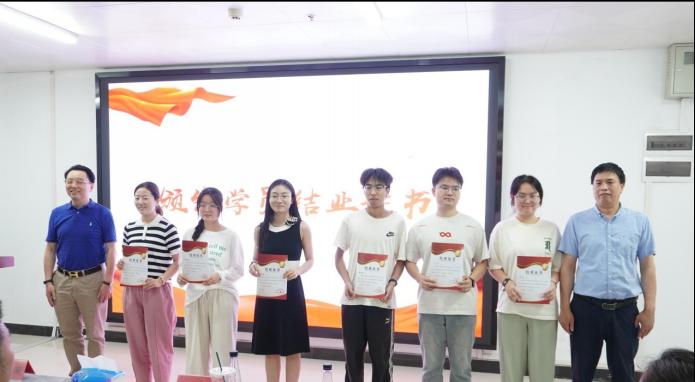 仪式现场举行了隆重的颁奖环节。与会领导和嘉宾分别为学员颁发结业证书,肯定了全体学员在训练营期间的认真付出。随后,优秀小组荣誉证书的颁发将现场气氛推向高潮,获奖小组代表上台领奖并合影留念,他们的合作精神与突出表现赢得了全场掌声。获奖小组代表表示,希望未来将学到的新媒体运营知识运用到创新创业实践中,并祝福在座的老师们万事顺遂,同学们前途似锦。